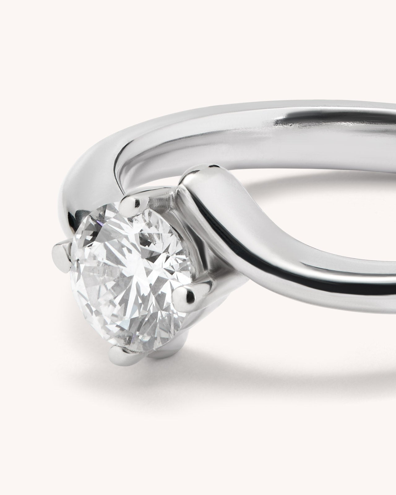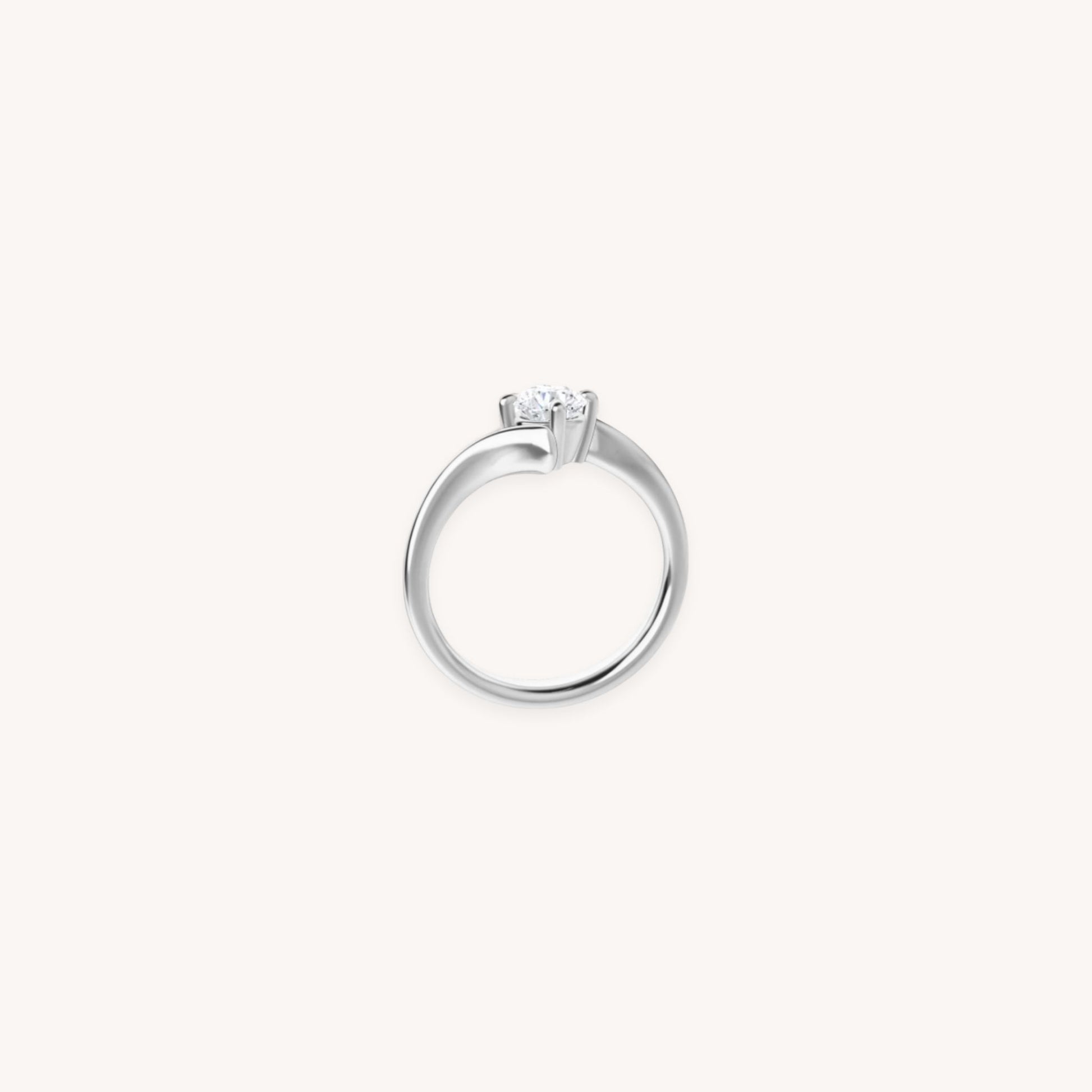 El aro se curva suavemente hasta abrazar el diamante en un engaste cruzado que deja la piedra suspendida, libre, y perfectamente visible desde todos los ángulos.